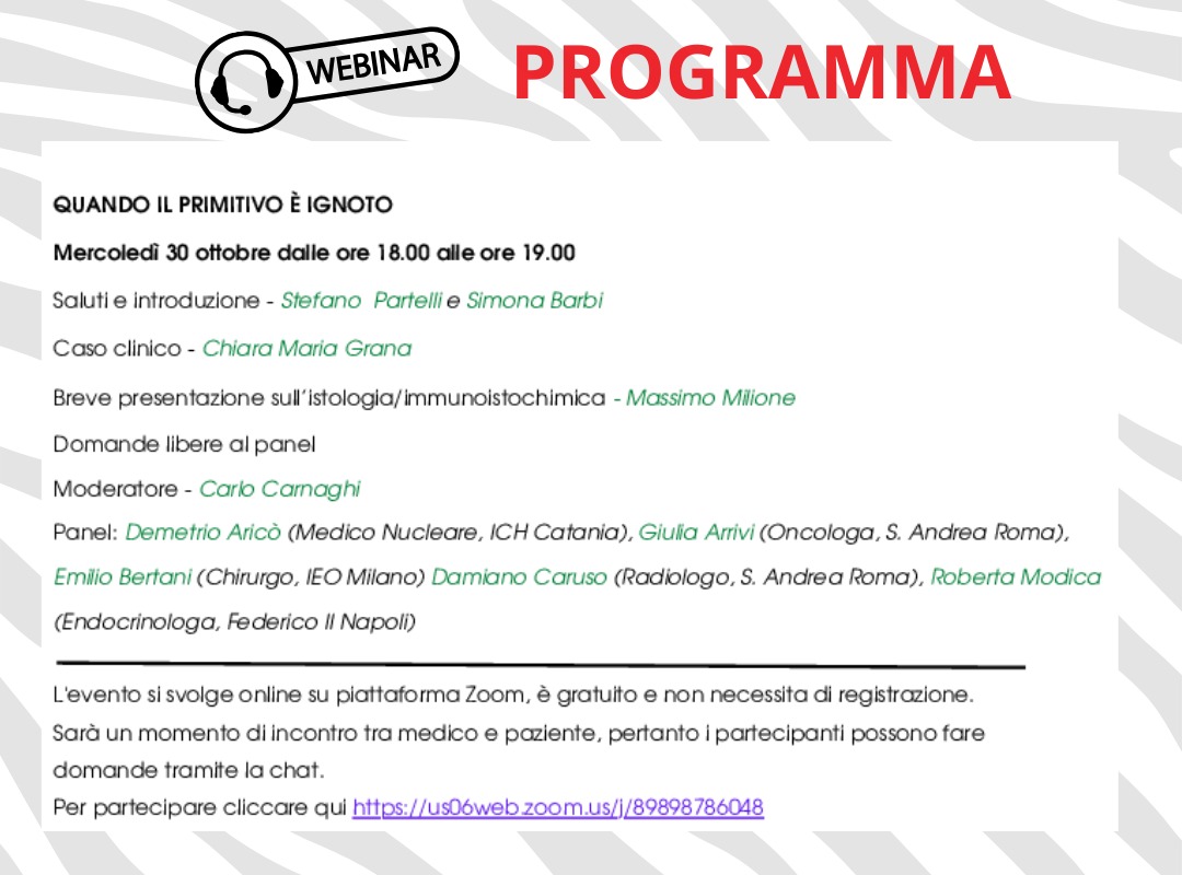 Riprendono gli appuntamenti con i webinar di Net Italy e Itanet: Mercoledì 30 ottobre 2024 dalle ore 18 alle ore 19, gli esperti tratteranno un nuovo argomento relativo ai tumori neuroendocrini: " Quando il primitivo è ignoto"